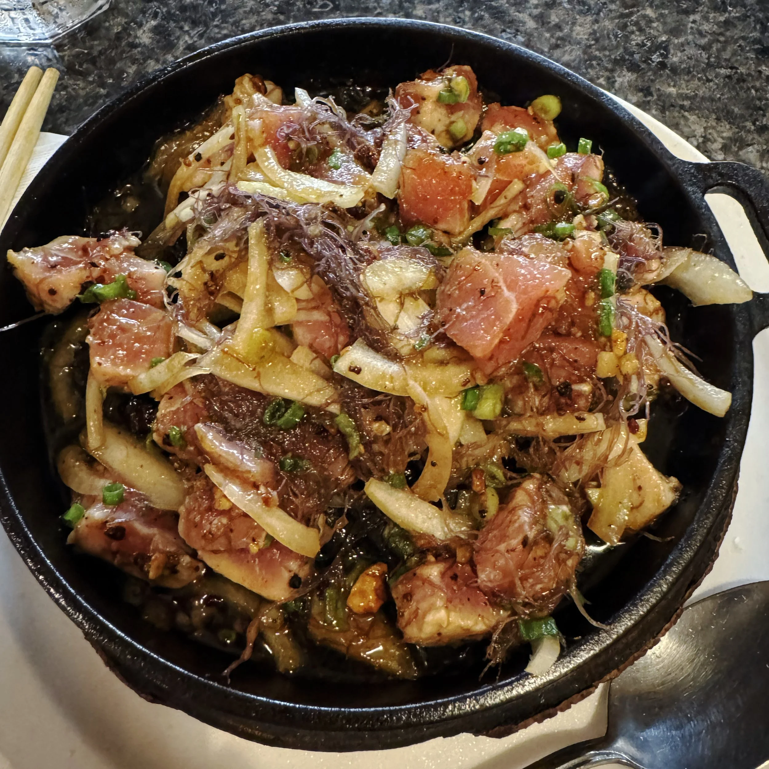 Next was a crowd pleaser, the Sizzling Tetsuyaki Poke dish. This is reminiscent of those sizzling platters of fajitas served at your favorite Mexican restaurant. This elevated take on the poke dish places the raw cubed pieces of ahi on a sizzling platters to sear the outside of the cubes of poke, which gives them a crust and new texture. Added to that is the traditional inamona, the traditional poke relish of crushed kukui nuts and salt to give crunch and texture to traditional poke. Additional ogo, onion and a sweet soy/onion dressing is added to round out the dish.Again, another elevated take on a traditional dishes using so many local ingredients.